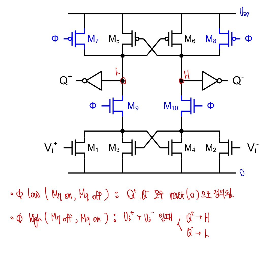2. Latch에서 M7 과 M8은 cross-coupled pair을 이루고 positive feedback을 통해 빠른 증폭을 얻을 수 있습니다.