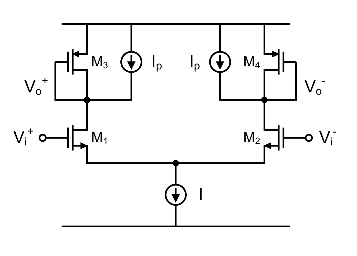 기본적으로 diode connected 구조를 이용하여 작지만 안정적인 gain을 얻습니다. 좀더 개선된 형태로 Ip라는 전류원을 이용하여 M3 M4의 전류를 줄이면 이들의 rout을 높일 수 있고 좀더 큰 gain을 얻을 수도 있습니다.
